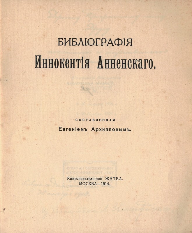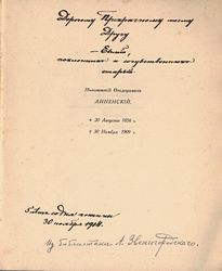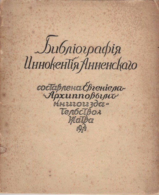 Иннокентий Федорович Анненский: Произведения И. Ф. Анненского на русском языке: Библиографический указатель / Ивановский государственный университет; Кафедра советской литературы; Сост. А. И. Червяков. Иваново, 1989. 108 с. Мягкая обложка, 108 с. Тираж 100 экз. Формат: 60x84 1/16. Бесплатно. Ответственный редактор: Ф. Г. Тапаева; редактор О. А. Кручинина. От составителя Библиографический указатель посвящен творчеству одного из крупнейших деятелей русской культуры начала XX века, выдающегося поэта, литературного критика, филолога, педагога, Иннокентия Федоровича Анненского (1855-1909). Настоящий указатель не является первой попыткой библиографического описания творческого наследия И. Ф. Анненского. Е. Архиппов1 в начале века и Ф. Ф. Ингольд2 издали свои опыты библиографии поэта. Однако неполнота, приблизительность этих трудов не позволяют назвать их научными, хотя это и не умаляет их ценности, что особенно касается работы Ингольда, впервые описавшего значительную часть публикаций И. Ф. Анненского в зарубежных изданиях. В предлагаемом указателе описываются тексты И. Ф. Анненского на русском языке3. Указатель состоит из двенадцати разделов, причем материалы в нем расположены в хронологическом порядке в рамках каждого из них. В случае отсутствия сведений о хронологической приуроченности публикации - в алфавитном порядке в пределах года. В указателе учитывается как первопубликации, так и перепечатки, за исключением перепечаток в газетах и в календарях, произведений И. Ф. Анненского с 1881 г. по 1988 г. На исчерпывающую полноту указатель не претендует - некоторые издания (преимущественно зарубежные), включающие в себя тексты И. Ф. Анненского, оказались недоступными для составителя. Для облегчения поиска нужного издания в описаниях отдельных произведений И. Ф. Анненского, опубликованных до 1940 г, в хрестоматиях и сборниках, указывается название издательства или типографии. Тексты И. Ф. Анненского, включенные в переиздания различного рода хрестоматий и сборников, описаны двояко: в случае полного совпадения (вплоть до страницы) публикаций делается указание на наличие последующих идентичных изданий, если же такого совпадения нет, то перепечатка описана как самостоятельная библиографическая единица. Рецензии в указателе даны в авторском описании И. Ф. Анненского. По недостатку места подписи под произведениями, кроме отдельных изданий, не оговариваются. Подписи "Анненский", "И. Анненский", "Иннокентий Анненский", "И. Ф. Анненский", "Ин. Ф. Анненский" опускаются. На произведения, подписанные псевдонимами, инициалами, или опубликованные анонимно, есть ссылки в указателе псевдонимов (авторство Анненского по отношению к целому ряду анонимных рецензий установлено составителем на основании материалов, хранящихся в Центральном государственном историческом архиве). Помимо указателя псевдонимов настоящее издание включает в себя алфавитный указатель произведений И. Ф. Анненского, в котором раскрывается содержание его книг4 и даются указания на публикации и перепечатки отдельных его произведений, а также именной указатель. Отрывки законченных произведений И. Ф. Анненского, опубликованные в хрестоматиях и антологиях, описываются в алфавитном указателе по основному авторскому заглавию, независимо от названий, данных им составителем или редактором изданий. Недостат