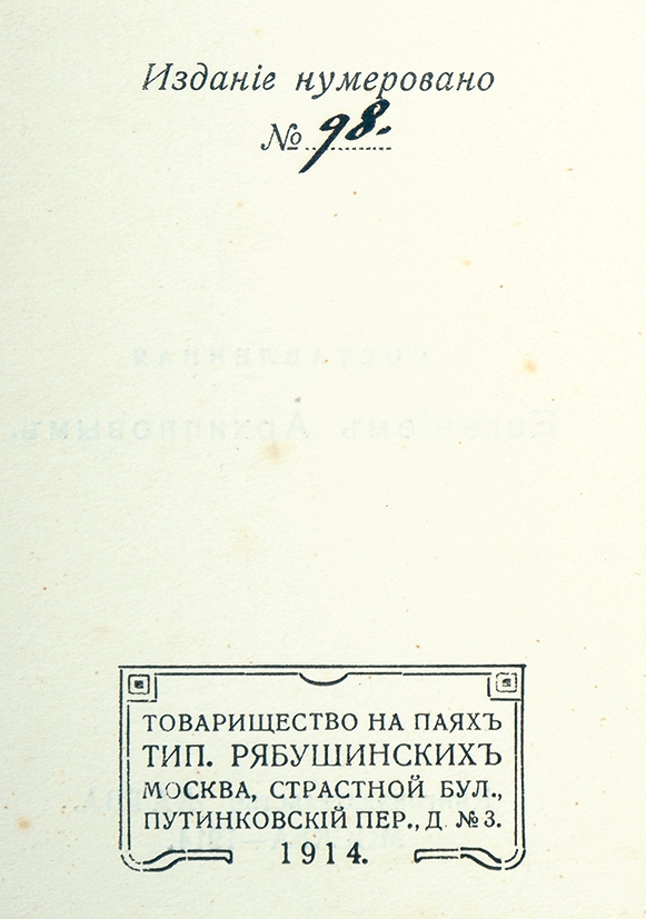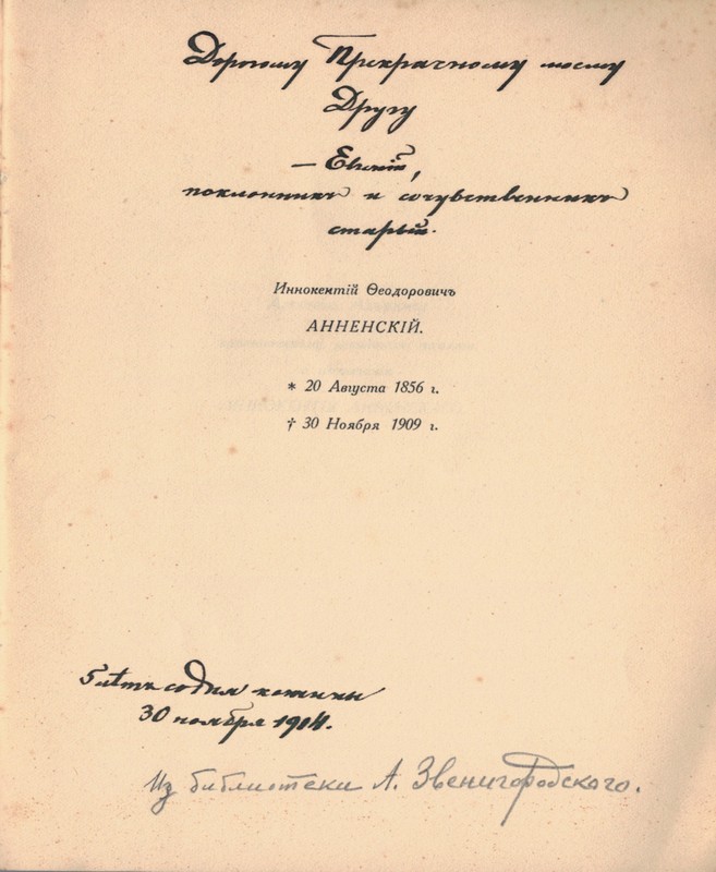 поэт, литературный критик. Изображение экземпляра книги ? 57 и и страницы журнального варианта из конволюта, принадлежавшего автору, с многочисленными рукописными вставками: lucas_v_leyden. Маргиналии собирателя: Анненский. Часть 2 (?? 17-32). В Национальной электронной библиотеке открыт непронумерованный экземпляр книги из РГБ.