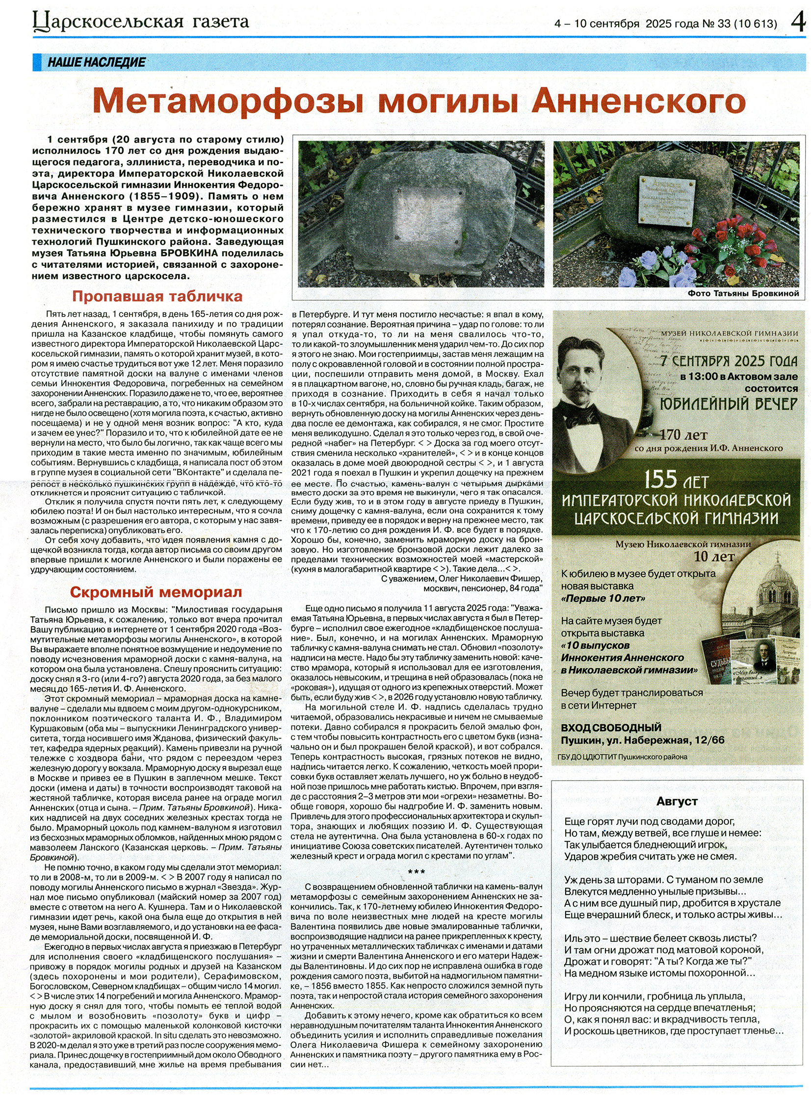 страницу Казанского кладбища. ** Эту табличку я нашёл осенью 2009 г. на соседнем участке. Почистил и поставил к металлическому кресту (см. фото на странице галереи). В 2015-м, при посещении на 160-е поэта, её уже не было. Мужская Николаевская гимназия в Царском Селе, где преподавал и позже исправлял должность директора Иннокентий Федорович (его недельная 'академическая нагрузка' доходила до 56 часов; имеющий опыт учительства может оценить это!), по существу явилась вторым Лицеем. (Отец поэта был выпускником первого, Александровского.) Список замечательных людей, выпускников Николаевской гимназии, сравним с лицейской плеядой. Имя одного из них, Николая Гумилева, увековечено на фасаде. Но - горестный парадокс! - имени его учителя (отнюдь не в гимназическом только смысле!) на стенах Николаевской гимназии нет. Вопиющая несправедливость! Не знаю, кто должен принять решение, но мемориальной доске с именем Анненского на фасаде здания бывшей гимназии быть! - и, чтобы снять финансовые затруднения, предлагаю свои услуги художника-графика и резчика. Сделать такую доску для меня было бы большой честью. Николаевская гимназия находится на углу Малой и Набережной улиц (в недавнем прошлом - Коммунаров и Пролеткульта). Я рад возвращению улицам Царского Села их исторических названий, но, думаю, не в ущерб исторической памяти было бы одну из названных улиц переименовать в улицу Анненского. Такого названия, как 'Малая', не очень жалко. Возможен и щадящий прежнее название компромисс. Улица Малая - длинная, идет от Каскадных прудов до самого Александровского парка. Можно было бы отрезок улицы от Набережной до, скажем, Оранжерейной назвать именем поэта, а за остальной ее частью сохранить прежнее название. В здании гимназии ее директор не только учительствовал, но и жил с семьей. Как естественно было бы создать здесь музей-квартиру поэта по примеру подобных музеев в Фонтанном доме и на Офицерской улице. Основная конструкция здания сохранилась до наших дней. Мемуарные заметки и другие материалы помогли бы воссоздать директорскую квартиру, пусть хотя бы кабинет Анненского, с письменным столом у окна и букетом лилий на нем - любимых цветов поэта.